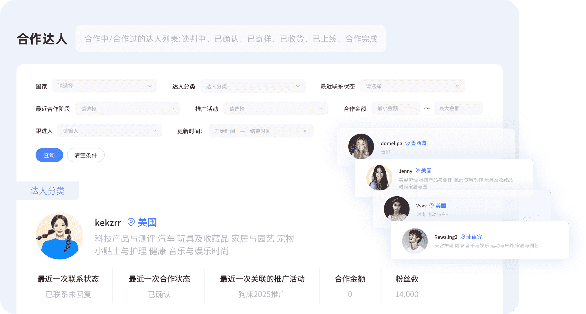 高效尋找并聯系達人,預判合作風險,追蹤效果,沉淀達人池,閉環管理,多次合作。